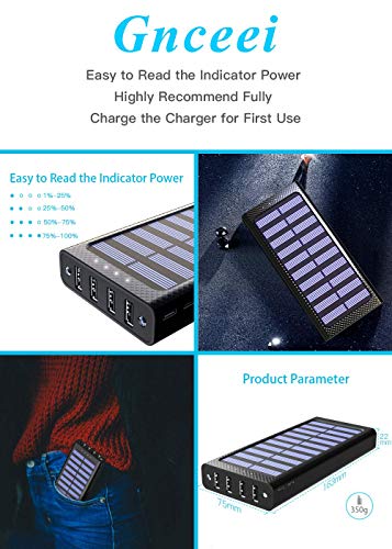 Un cargador solar portátil que puede recargarse mediante  cable USB-C, cable micro USB o un cable Lightning. Con un adaptador 2,4A puede alcanzar la carga completa en 10 u 11 horas. Puede cargar simultáneamente cuatro dispositivos.